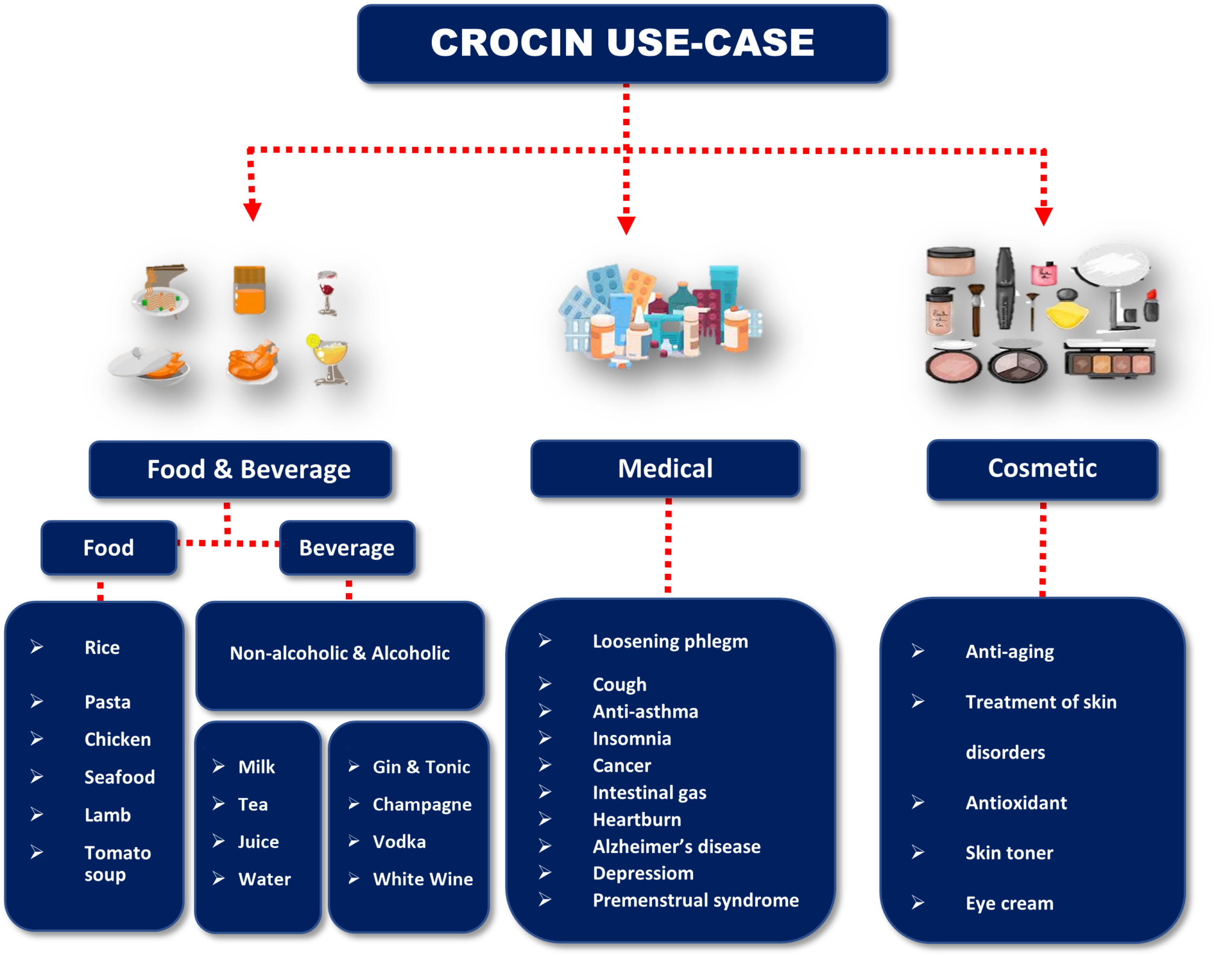 - Crocin could also be used as a phototherapy, treatment of skin disorders, acne, scares, as well as bone augmentation, repair and regeneration. Crocin has been filed for promoting spermatogenesis. It can be made into tablets, capsules or different oral dosage forms.